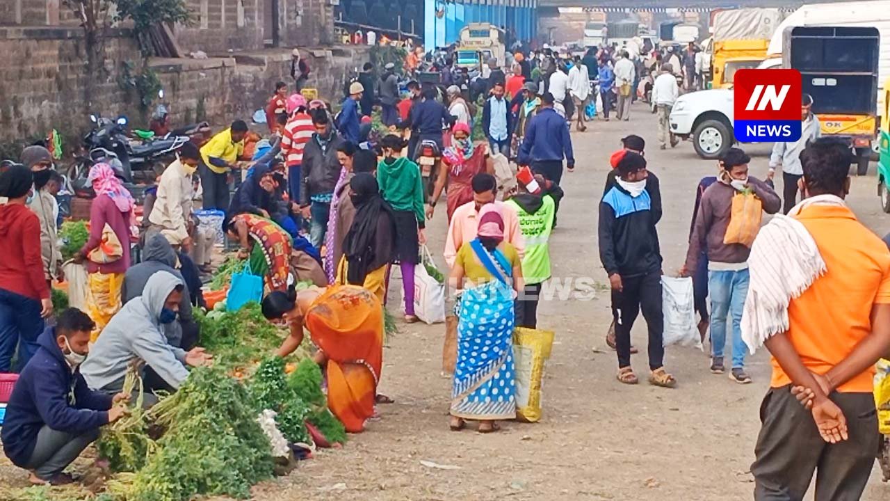 बेळगावातील एपीएमसी मार्केटयार्डात रविवारी सकाळी ग्राहकांची तोबा गर्दी झाल्याने कोरोना नियमांचा फज्जा उडाला.