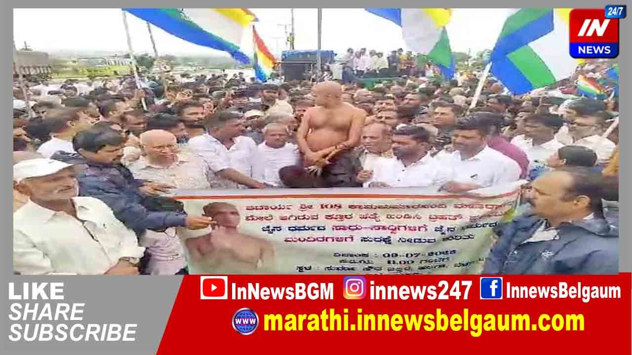 हिरेकोडी येथील जैन मुनी कामकुमार नंदी महाराज यांच्या हत्येच्या निषेधार्थ बेळगावात आज जैन समाजबांधवांनी एल्गार पुकारला. बेळगावात सुवर्ण विधानसौध समोर पुणे-बंगळुर राष्ट्रीय महामार्ग 4 रस्ता रोको करून आंदोलन केले. चिक्कोडी तालुक्यातील हिरेकोडी येथील नंदीपर्वत आश्रमाचे जैन मुनी १०८ कामकुमार नंदी महाराज यांच्या हत्येचा निषेधार्थ बेळगावात आज जैन समाजबांधवांनी उग्र आंदोलन केले. सुवर्ण विधानसौध समोर राष्ट्रीय महामार्ग 4 पुणे बंगळुरू रस्ता रोको करून आंदोलन करून जैन मुनी, स्वामीजींना संरक्षण देण्याची मागणी केली.
