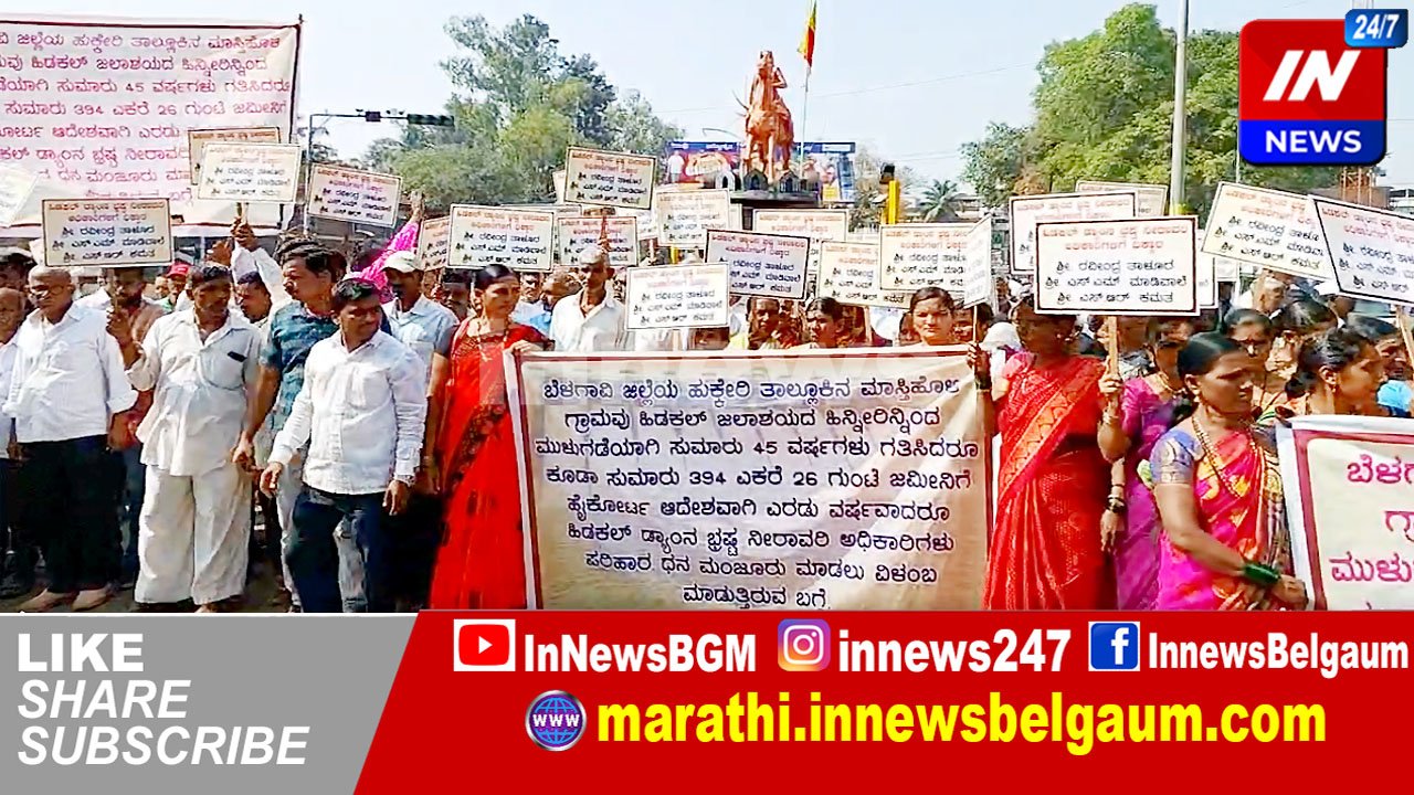 हिडकल जलाशयाच्या बॅक वॉटरमध्ये जमीन गमावलेल्या मास्तीहोळी गावातील शेतकऱ्यांनी 45 वर्षे उलटूनही भरपाई न मिळाल्याने आज एल्गार पुकारला. भरपाईच्या मागणीसाठी बेळगावात भव्य मोर्चा काढून त्यांनी पाटबंधारे कार्यालयाला घेराव घालून बेमुदत धरणे आंदोलन सुरु केले.