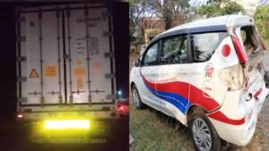 हिरेबागेवाडी पोलिस ठाण्याच्या हद्दीतील कोंडसकोप्प क्रॉस जवळ राष्ट्रीय महामार्गावर हायवे पेट्रोलिंगवरील एर्टिगा कारला मागून कंटेनर वाहनाने धडक दिली. या धडकेत पोलिस ठाण्याचे अधिकारी असलेले एएसआय बी. एस. नागणवर आणि एपीसी बर्की गंभीरपणे जखमी झाले आहेत. सध्या दोघांनाही बेळगावच्या येथील केएलई रुग्णालयात उपचारासाठी दाखल करण्यात आले आहे .