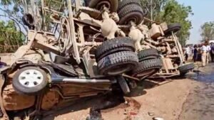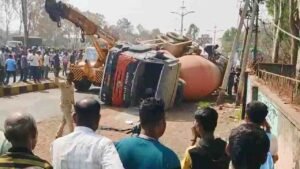 काँक्रीट भरलेल्या लोरीच्या ठोकरीने कारचे मोठे नुकसान झाले मात्र, सुदैवाने कारमधील दोघेजण बचावले. अपघातानंतर कारची स्थिती पाहता कार मधील दोघांचे वाचणे हा एक चमत्कारच म्हटला पाहिजे.