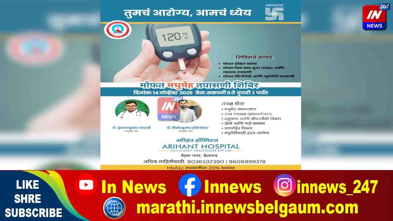 अरिहंत हॉस्पिटलतर्फे शुक्रवारी मोफत मधुमेह तपासणी शिबीर