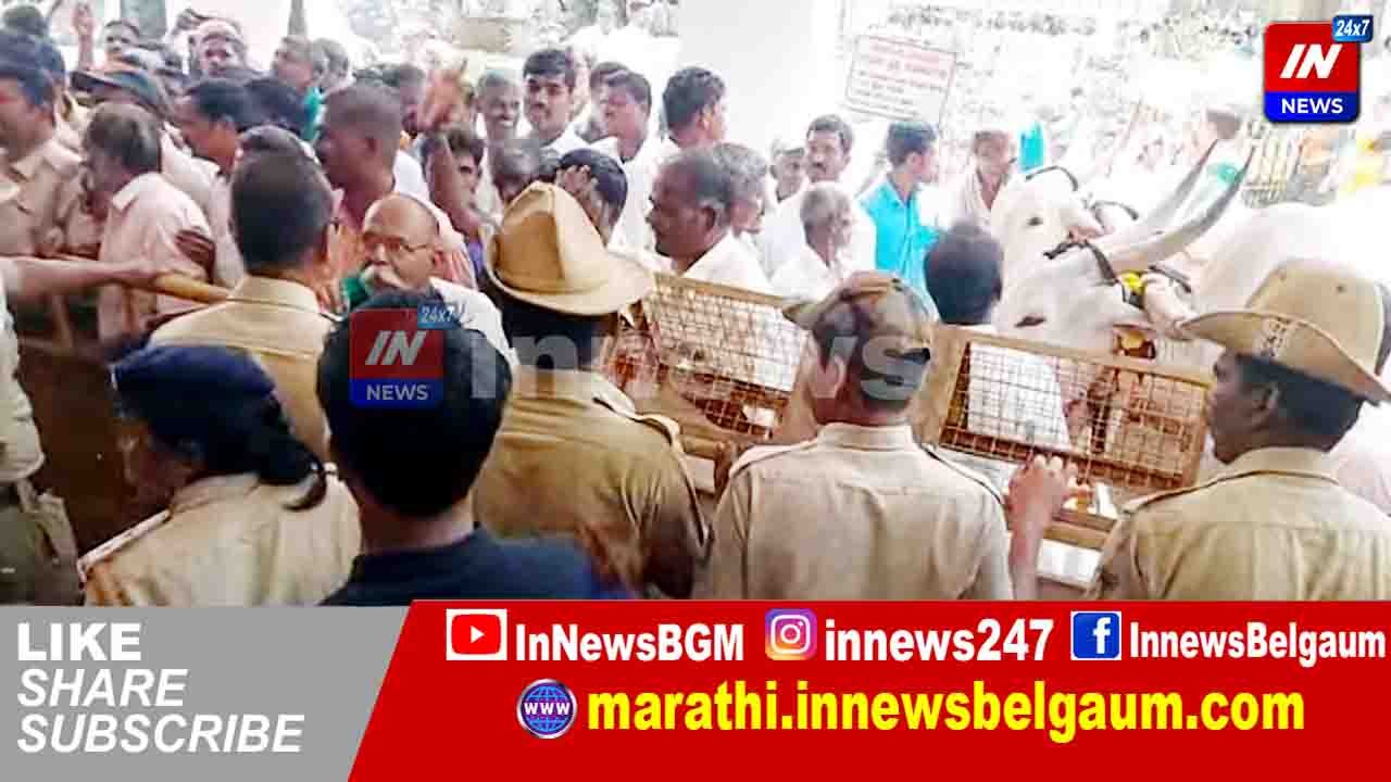 हिडकल धरणग्रस्त शेतकऱ्यांचे बैलगाड्या, कुटुंबियांसह चन्नम्मा चौकात आंदोलन