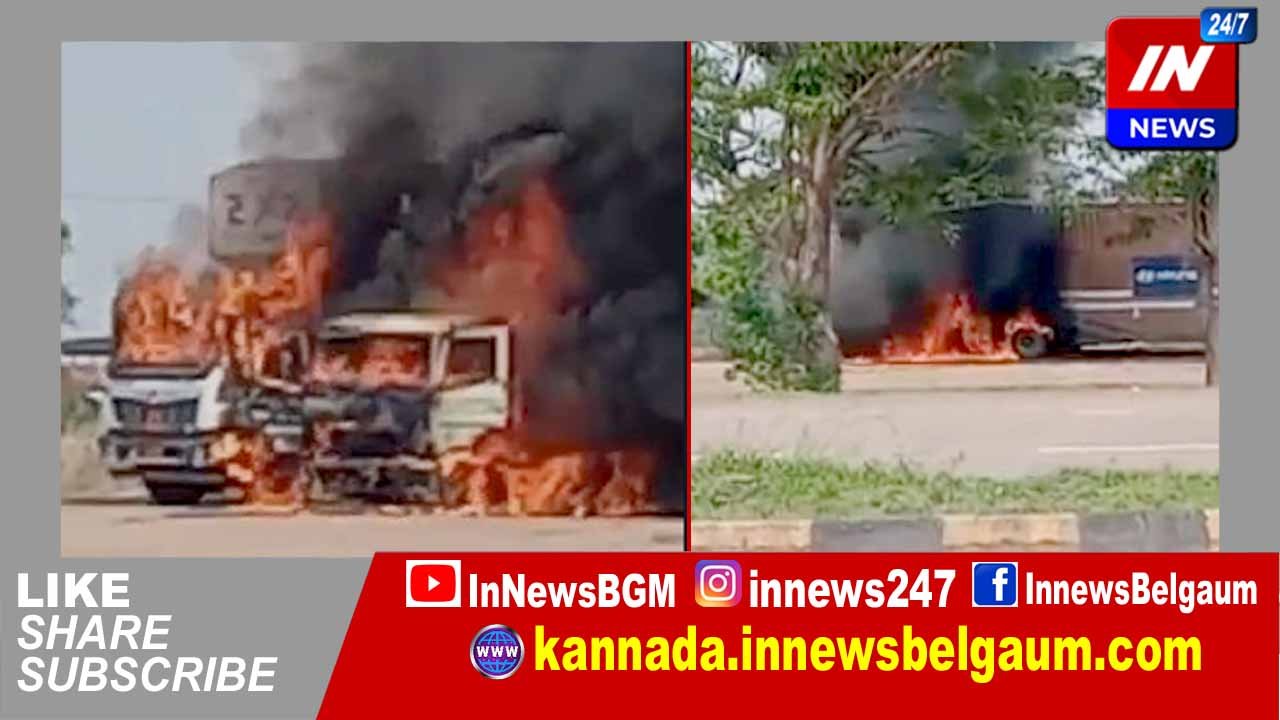 कर्नाटक/निपाणी/थांबलेल्या दोन कंटेनरसह १६ कार जळून खाक