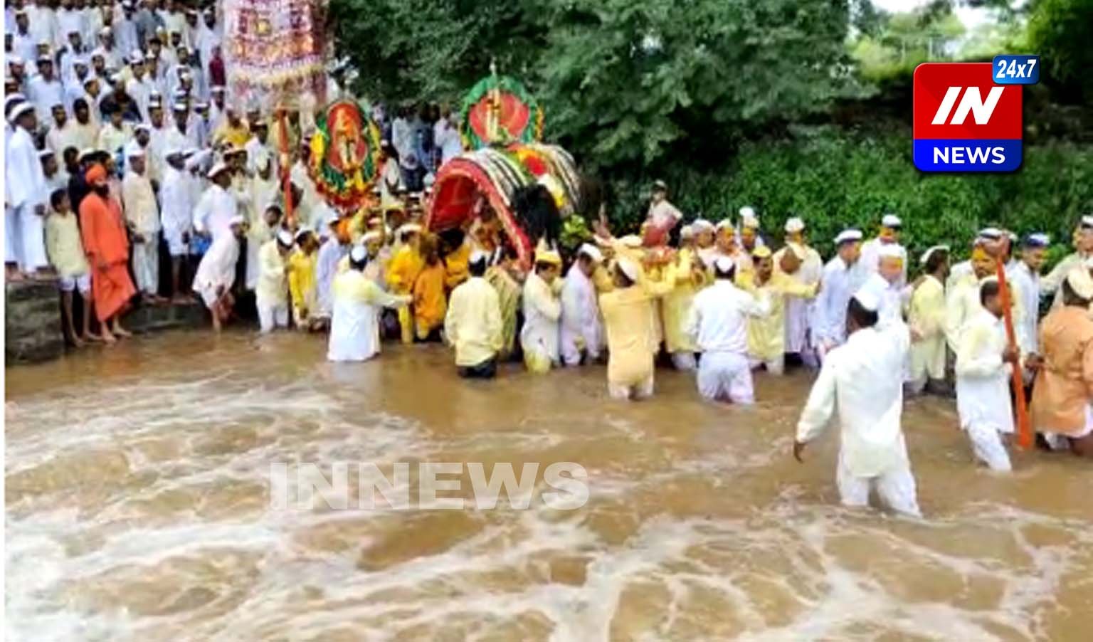 भरून वाहणाऱ्या नाल्यातून अप्पाचीवाडीत हालसिद्धनाथांची पालखी